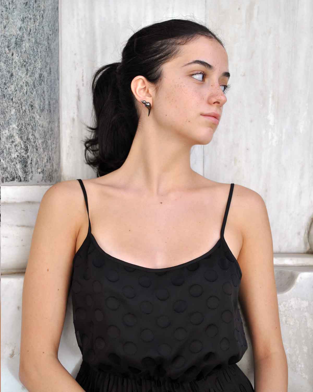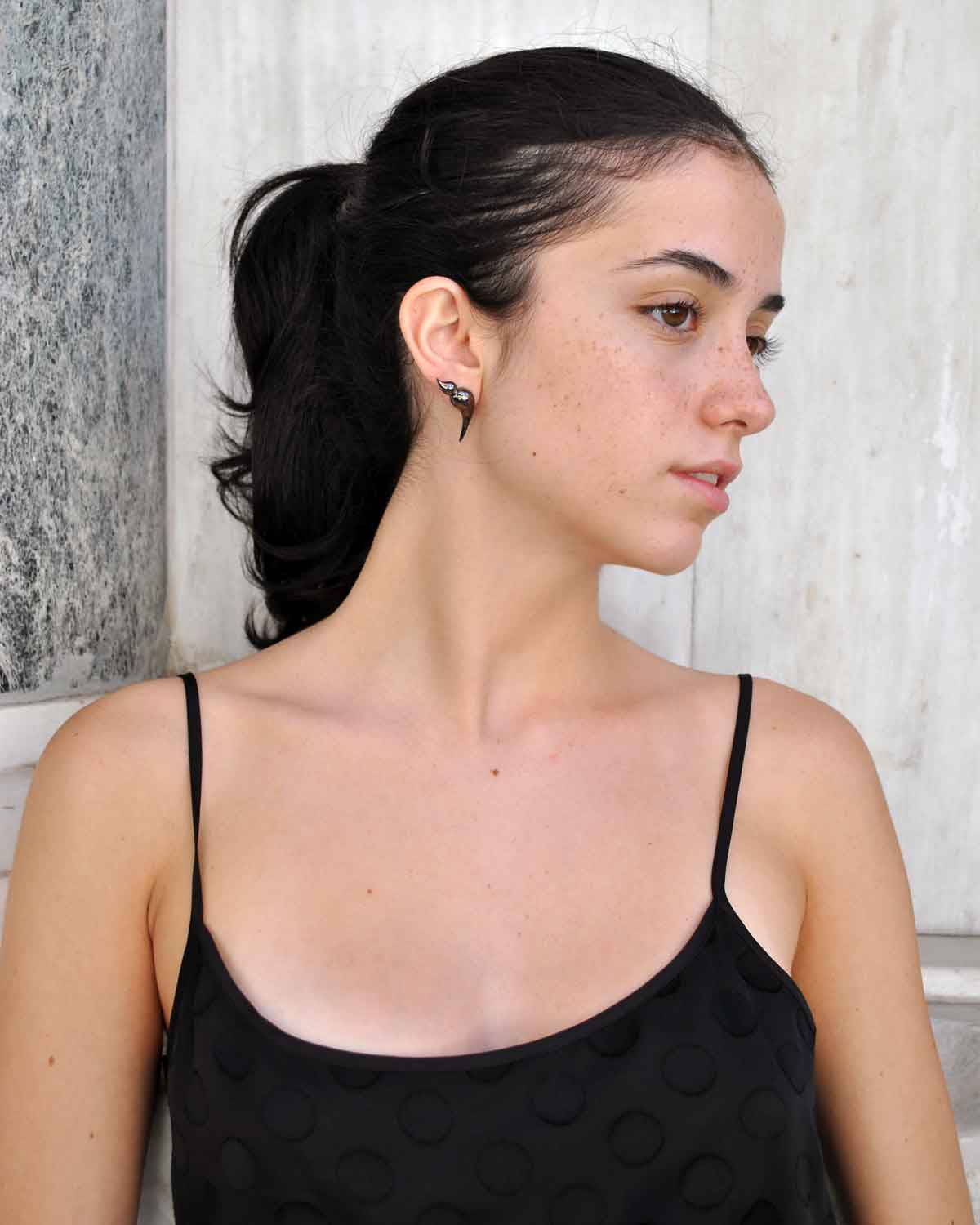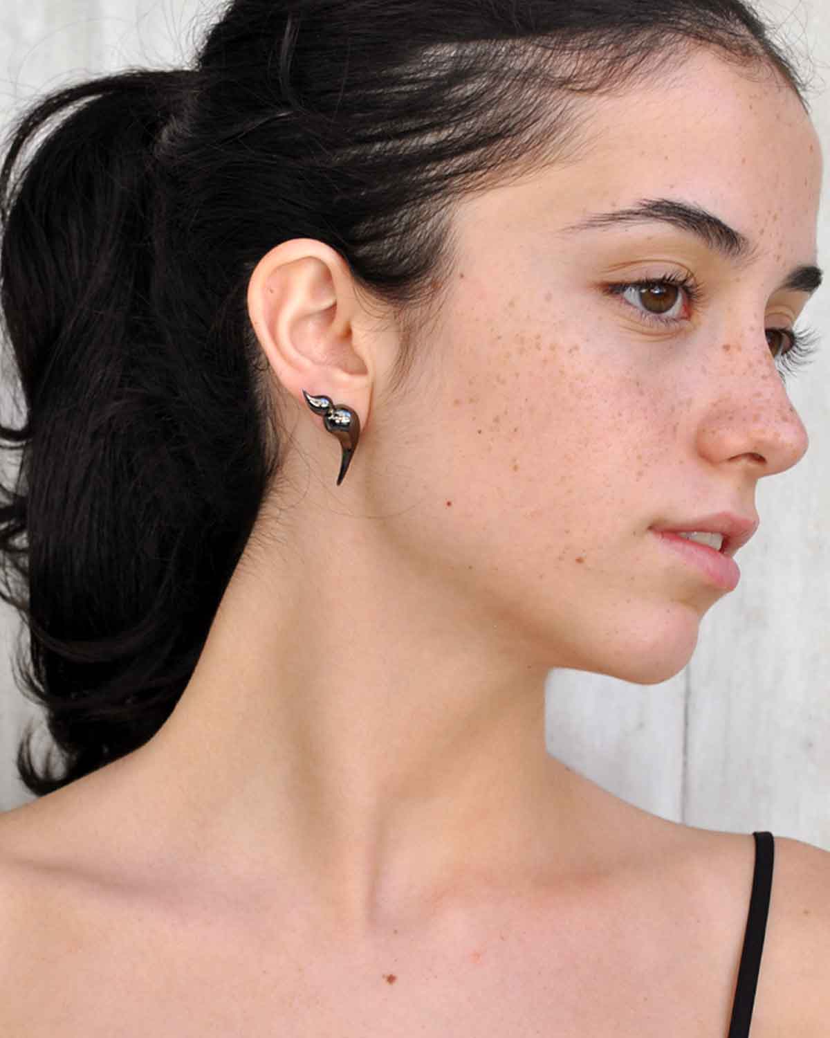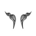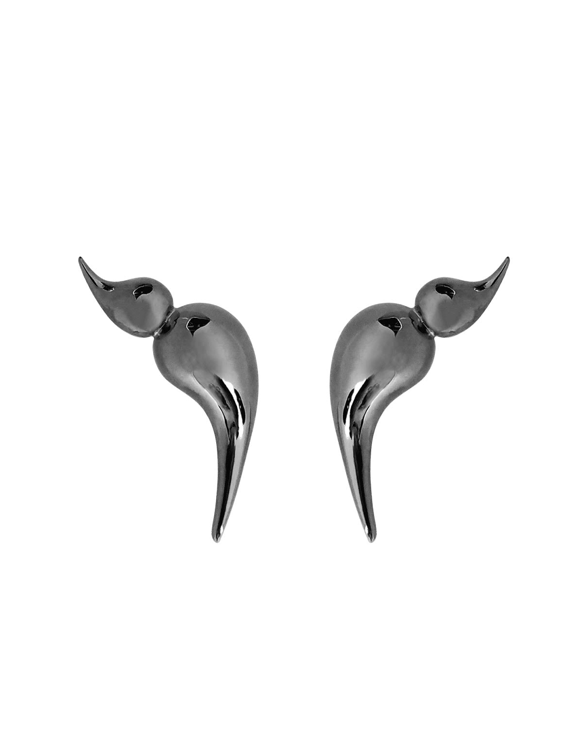 Sleek and modern, the twin rhodium drops reflect depth and mystery. Ideal for simple, sharp looks, they pair with the Black Long Drop Earrings for a dramatic statement.