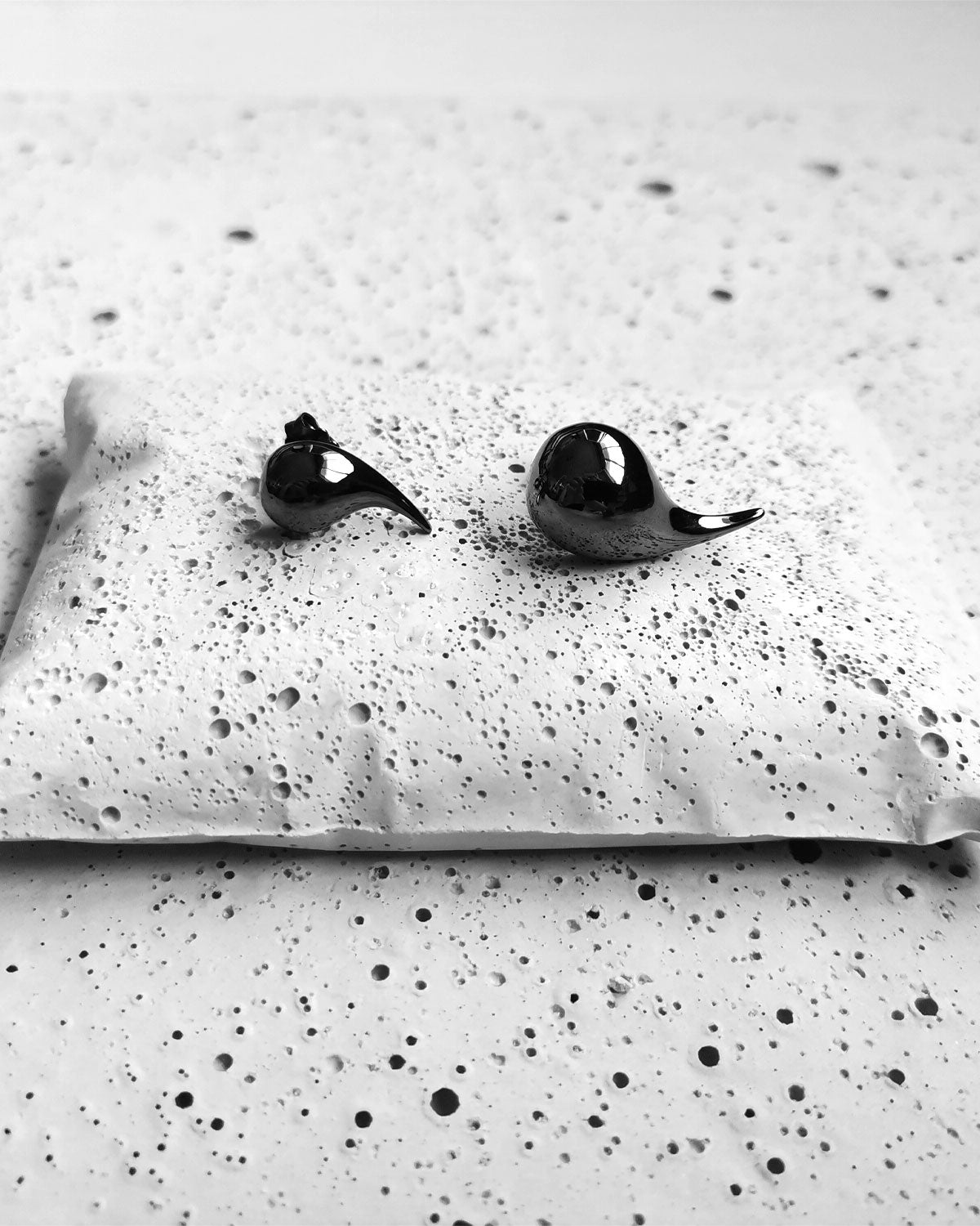 Bold and sleek, these asymmetrical drops in rhodium-plated silver echo the depth and mystery of water at night. Striking against pared-back looks, they pair perfectly with the Black Drop Rings, small and large, for a dramatic monochrome effect.
