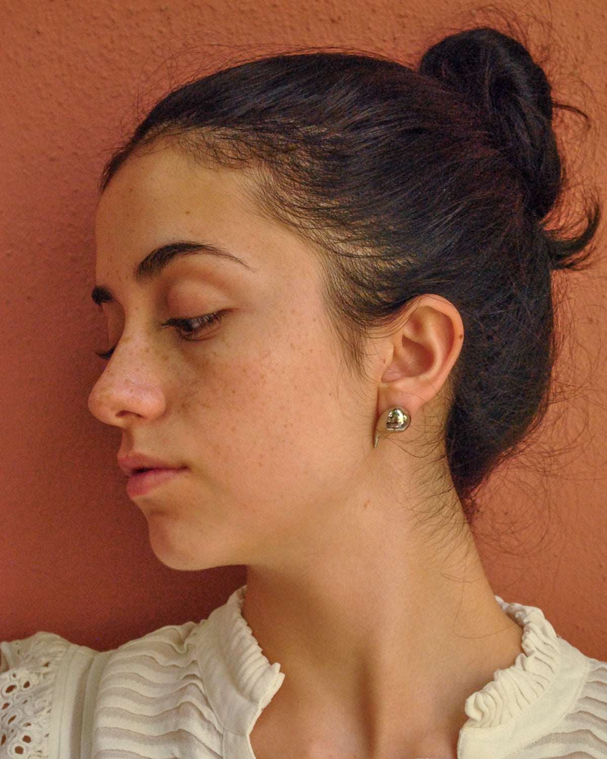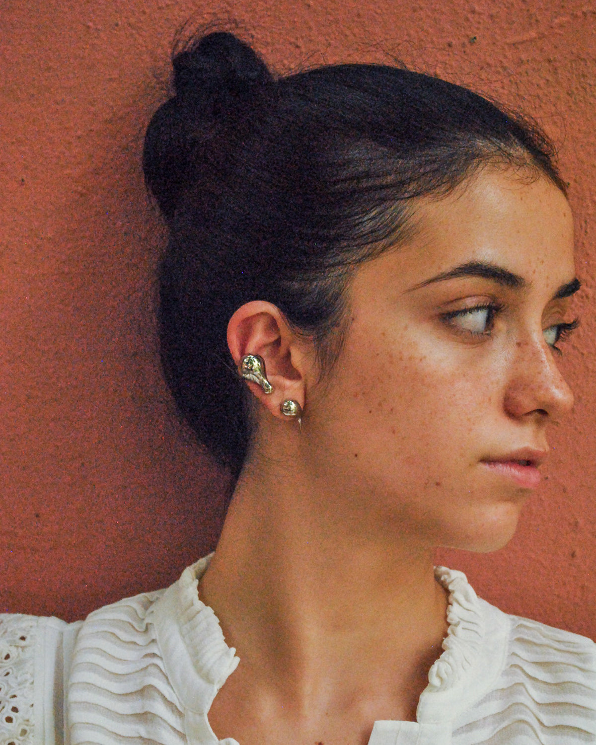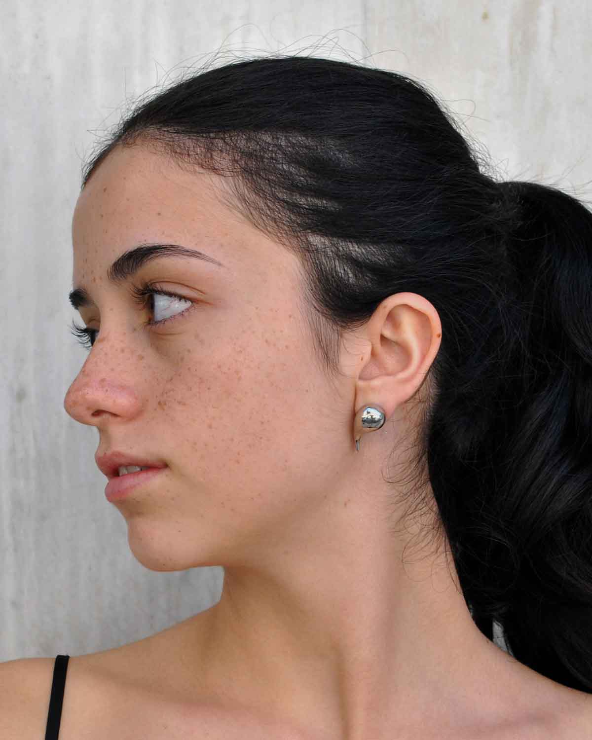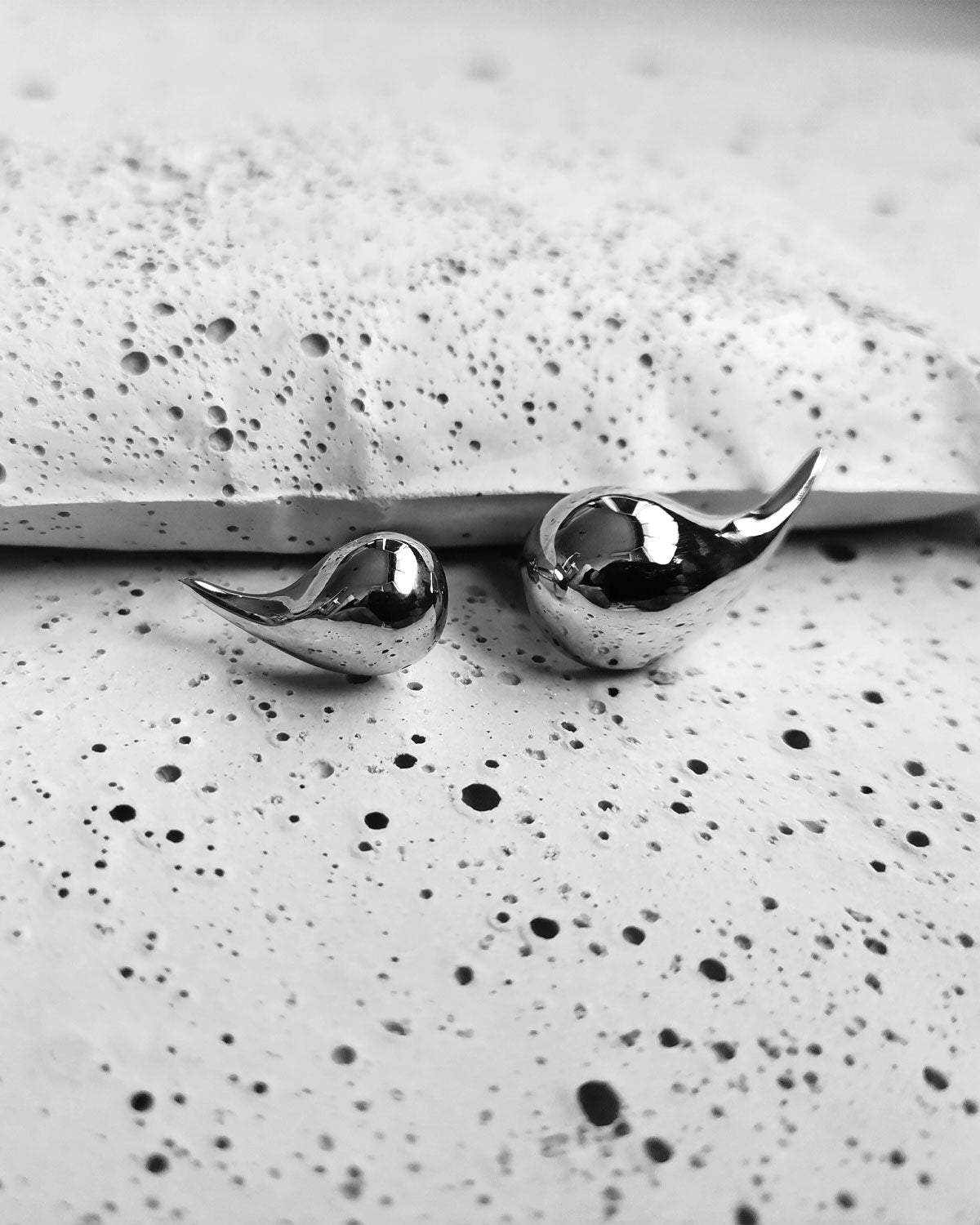 Asymmetry becomes elegance with this sculptural silver pair, balancing a bold drop with a smaller one. Their polished curves reflect the fluidity of water and bring subtle movement to the face. Perfect with minimal outfits, they can be styled with the Silver Drop Rings, small and large, for a refined, cohesive look.