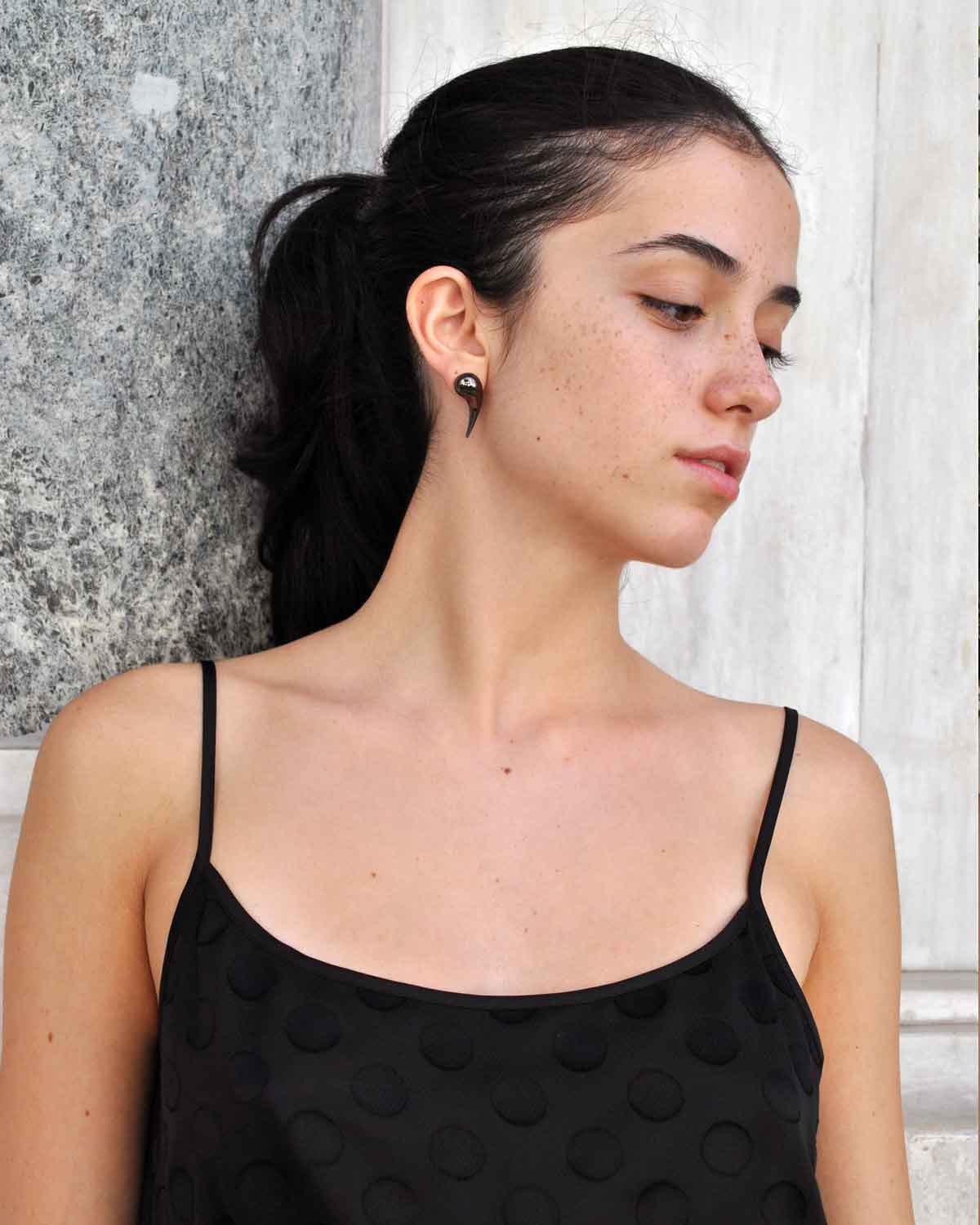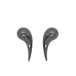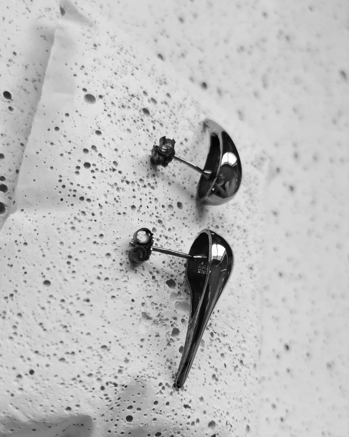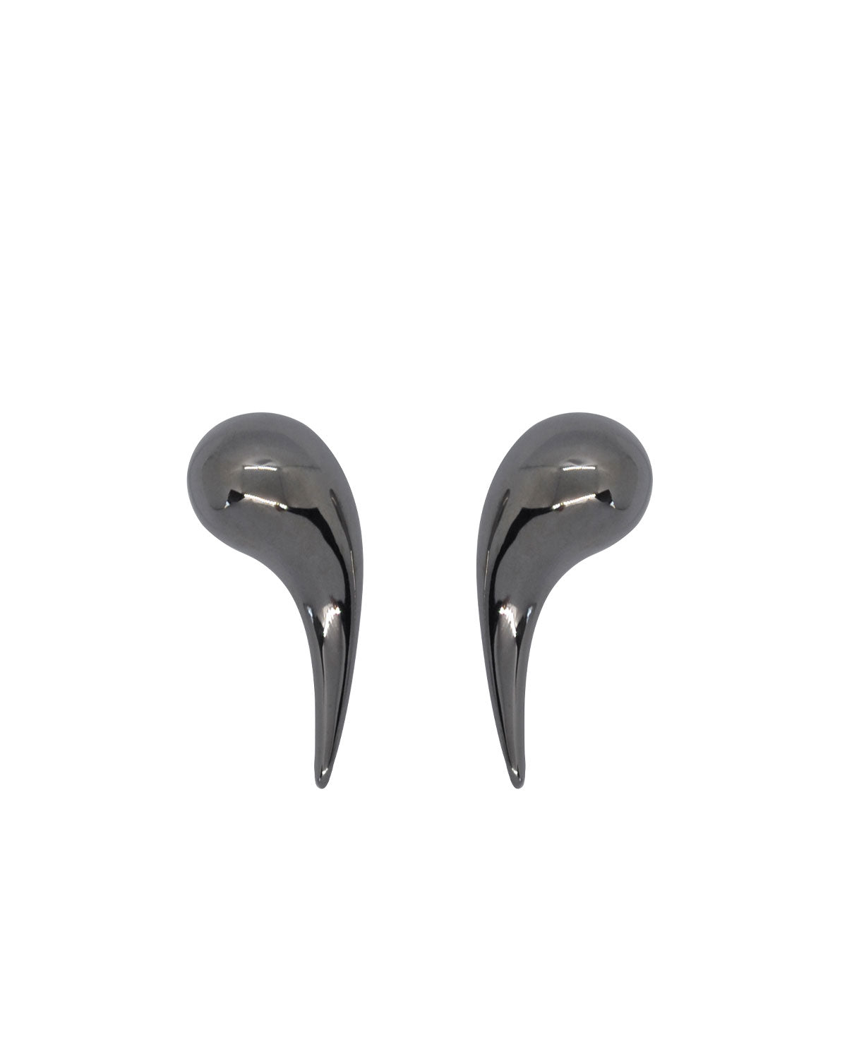 Sleek and architectural, these long rhodium-plated drops create a bold silhouette. Their dark reflective finish adds edge to minimal styling. Combine them with the Black Non-Identical Drop Earrings for a modern layered ear statement.
