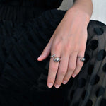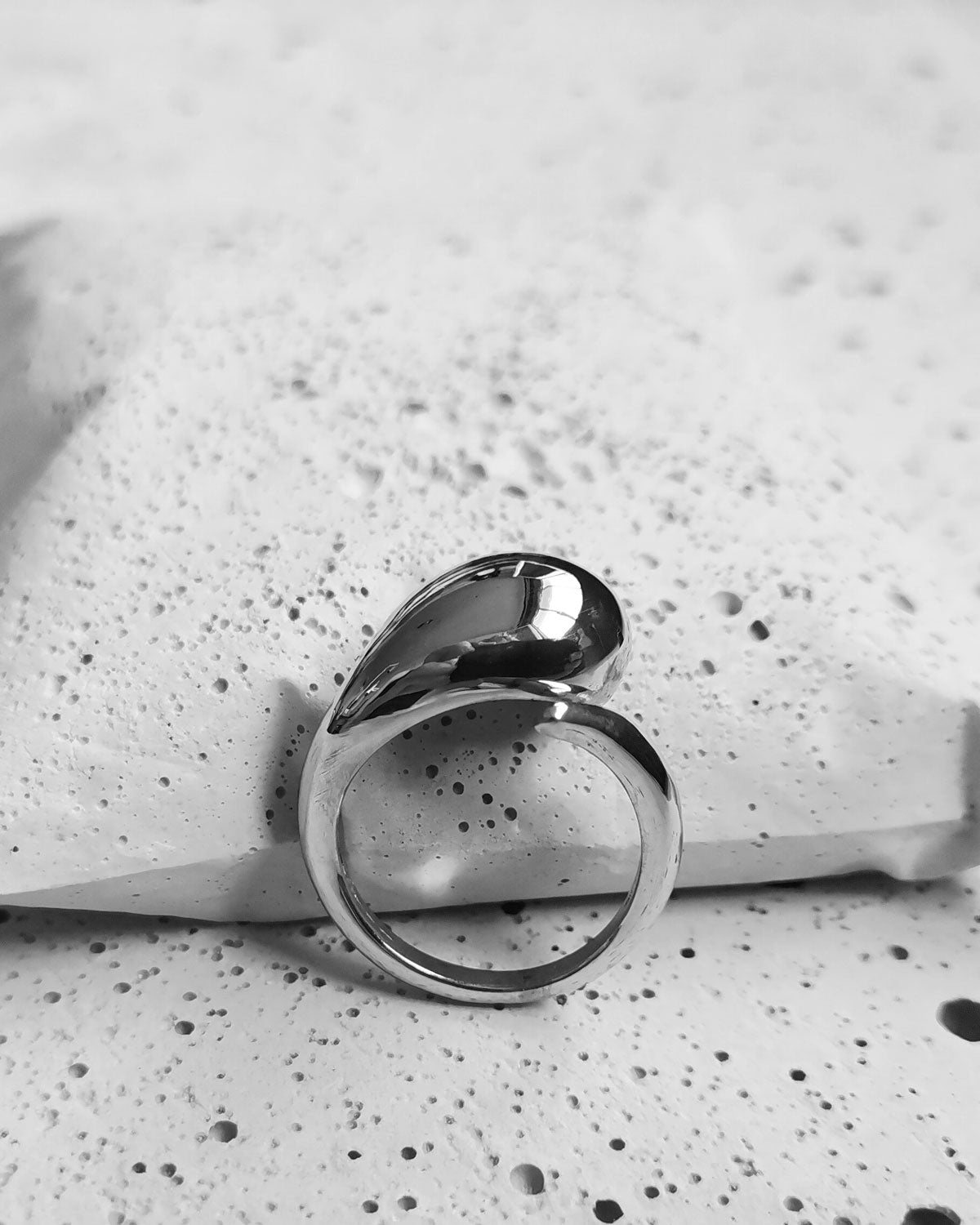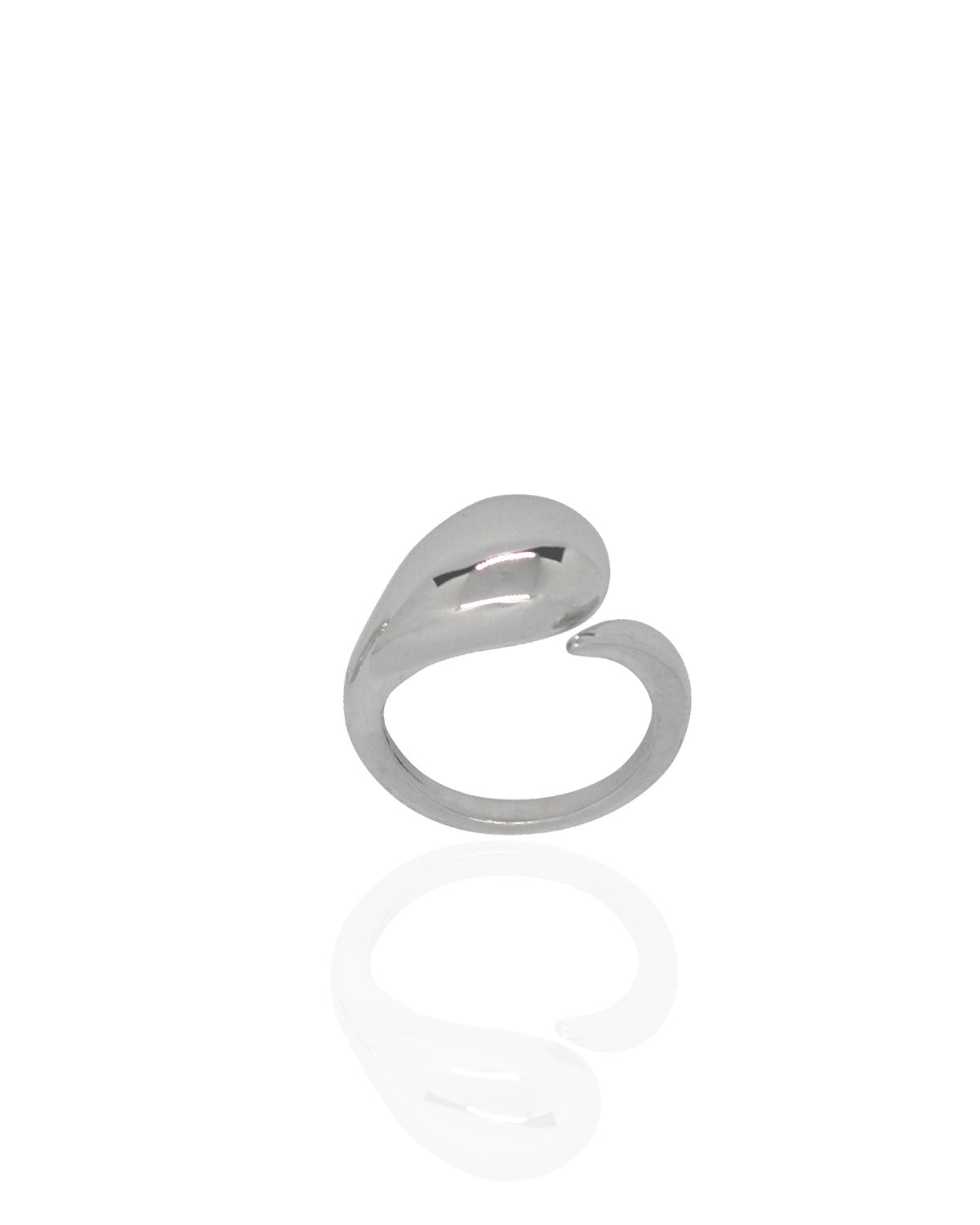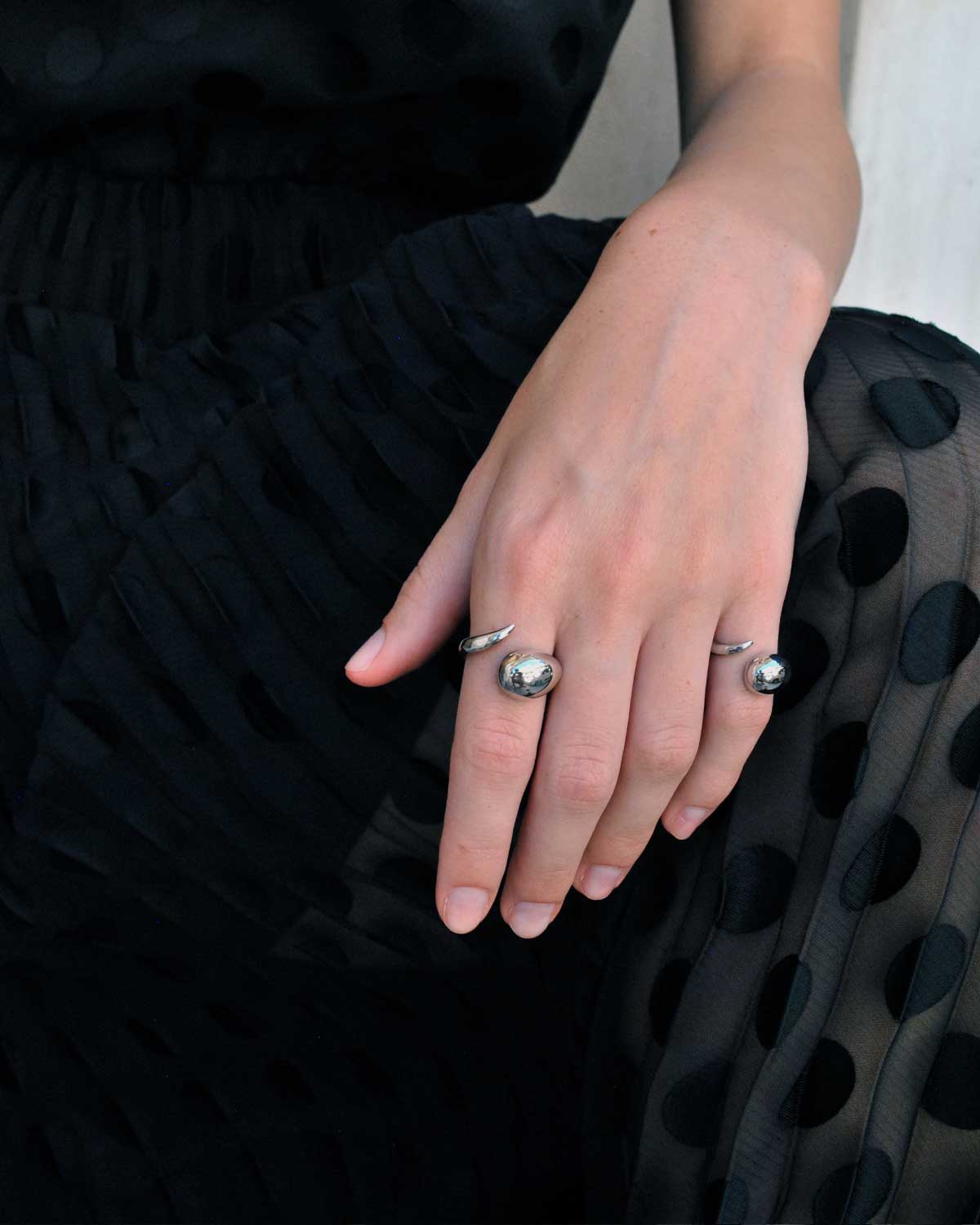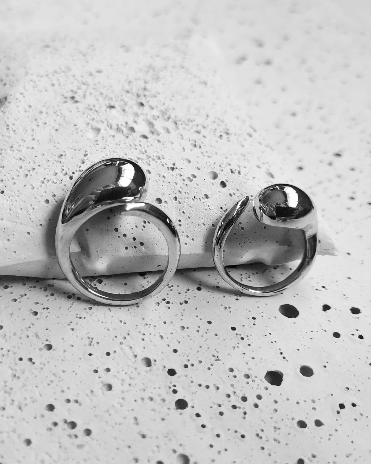 Bold and sculptural, the large silver drop makes a strong statement on the hand. Best styled with minimal clothing, it pairs naturally with the small silver drop ring for a layered effect.
