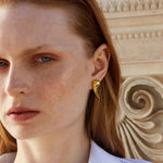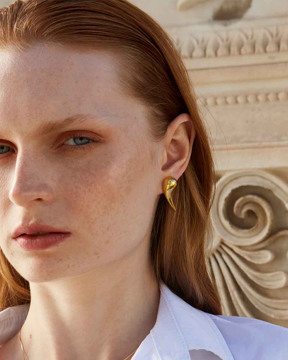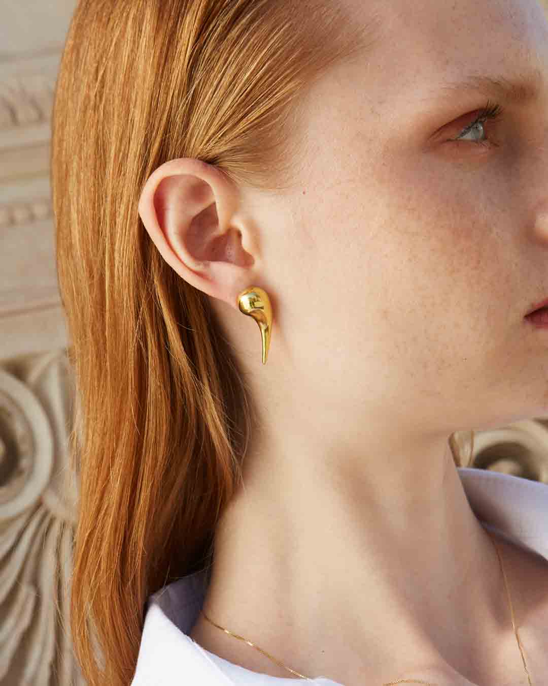 A golden curve of fluidity, these elongated earrings catch light with every movement. Radiant yet minimal, they bring elegance to day-to-night looks. Pair them with the Gold Non-Identical Drop Earrings for a striking combination.