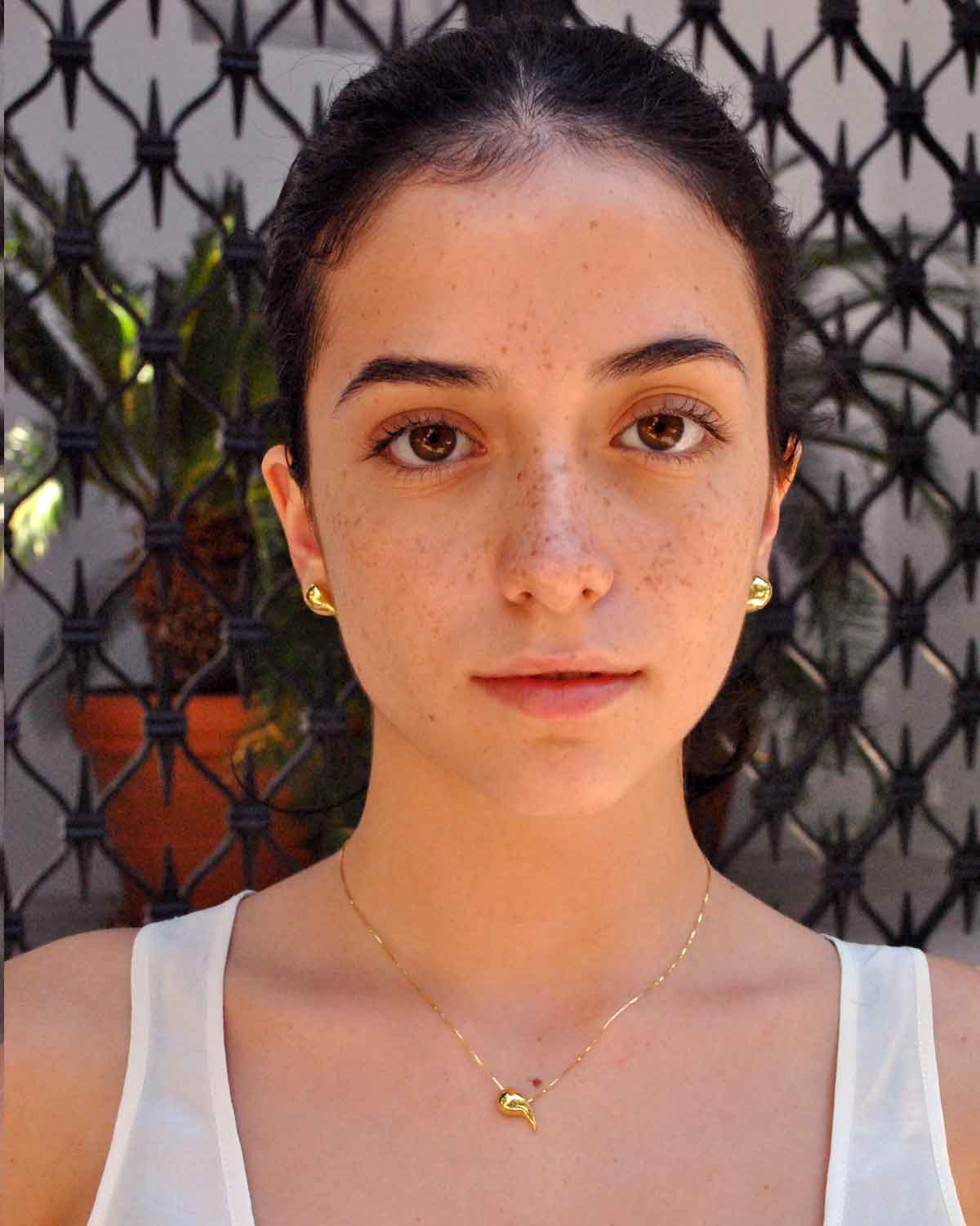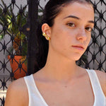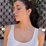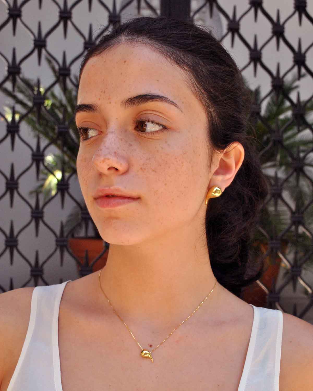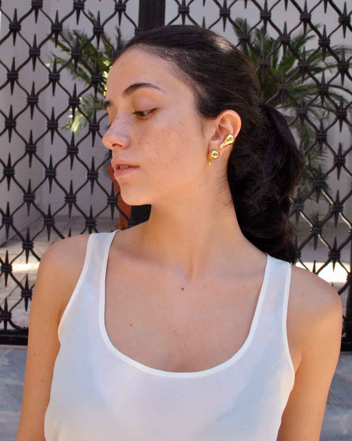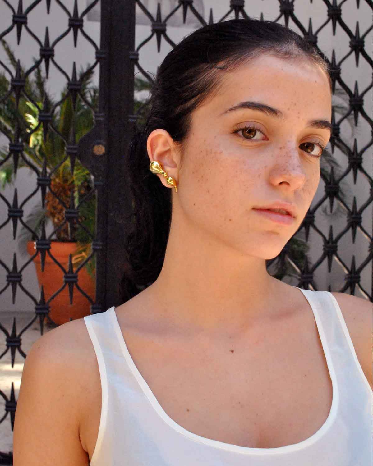 Fluid and radiant, this golden duo celebrates contrast in scale. Their polished finish mirrors light beautifully, adding warmth to both casual and evening minimal styling. Pair them with the Gold Drop Rings, small and large, for a harmonious golden set.