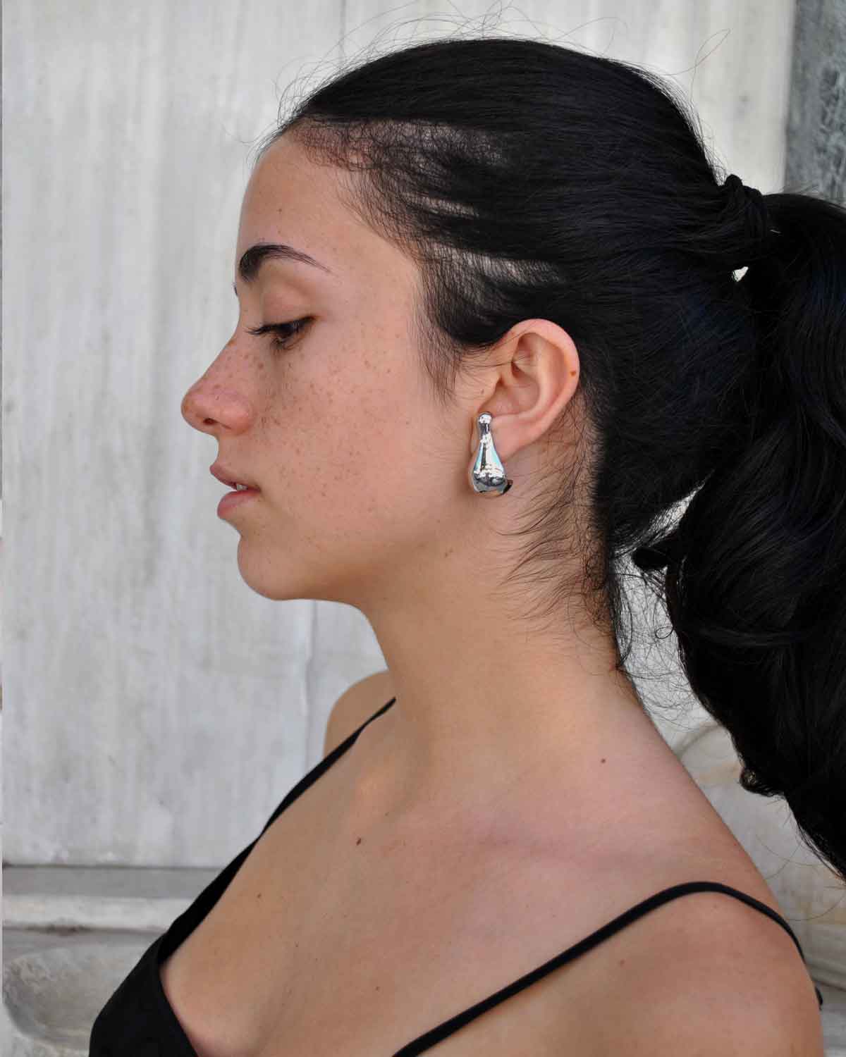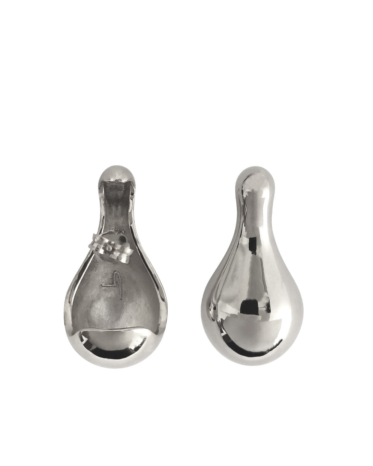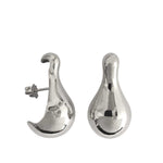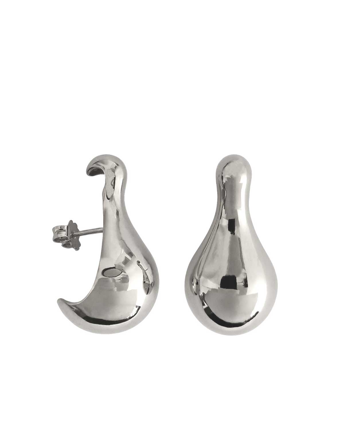 Continuous curves of polished silver flow together in sculptural motion. The double form creates depth and rhythm, reflecting light with every turn of the head. Bold yet minimal, they echo the collection’s essence of fluid metal. Pair with the Silver Liquid for a seamless line of movement.