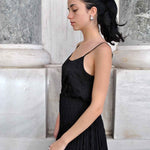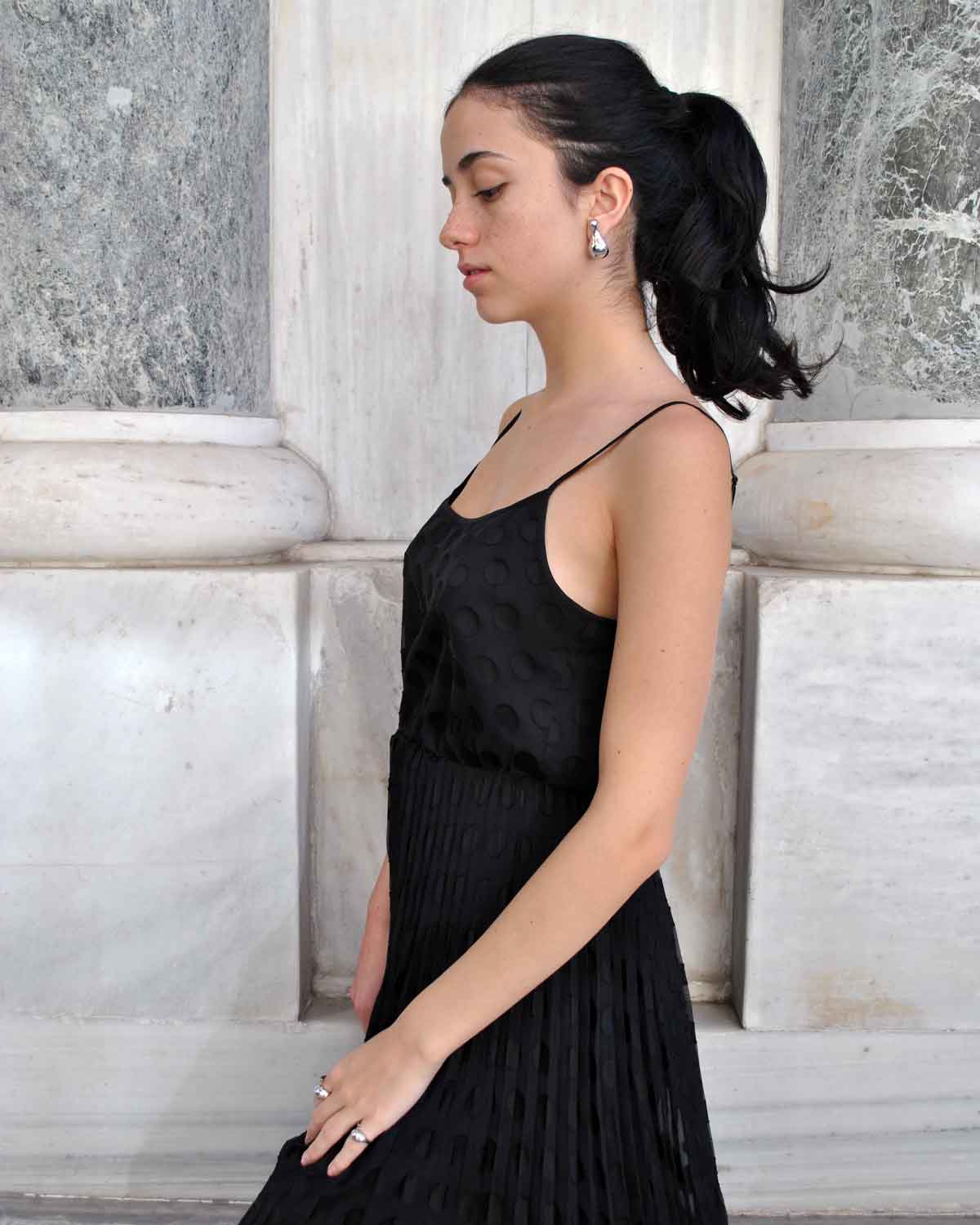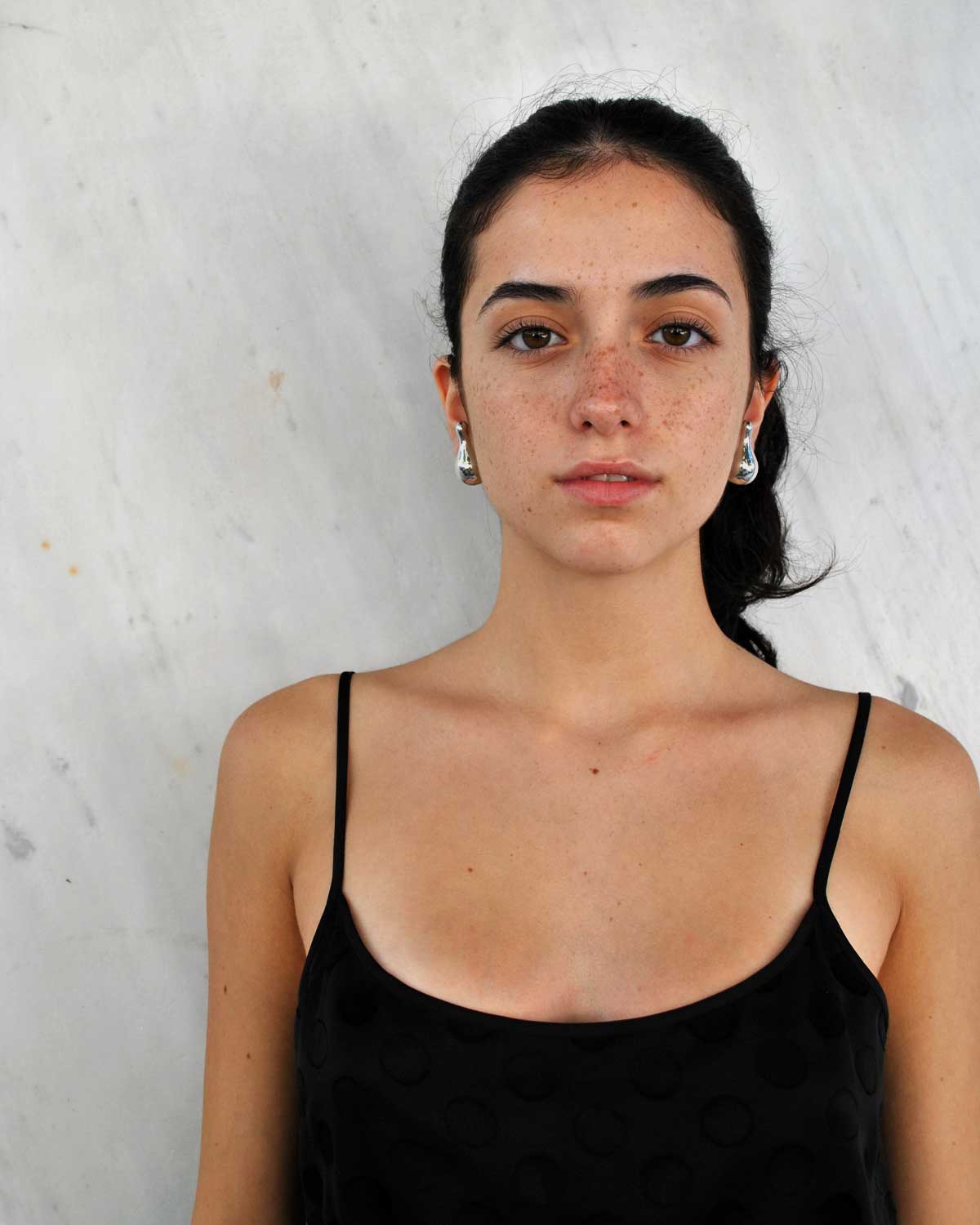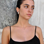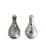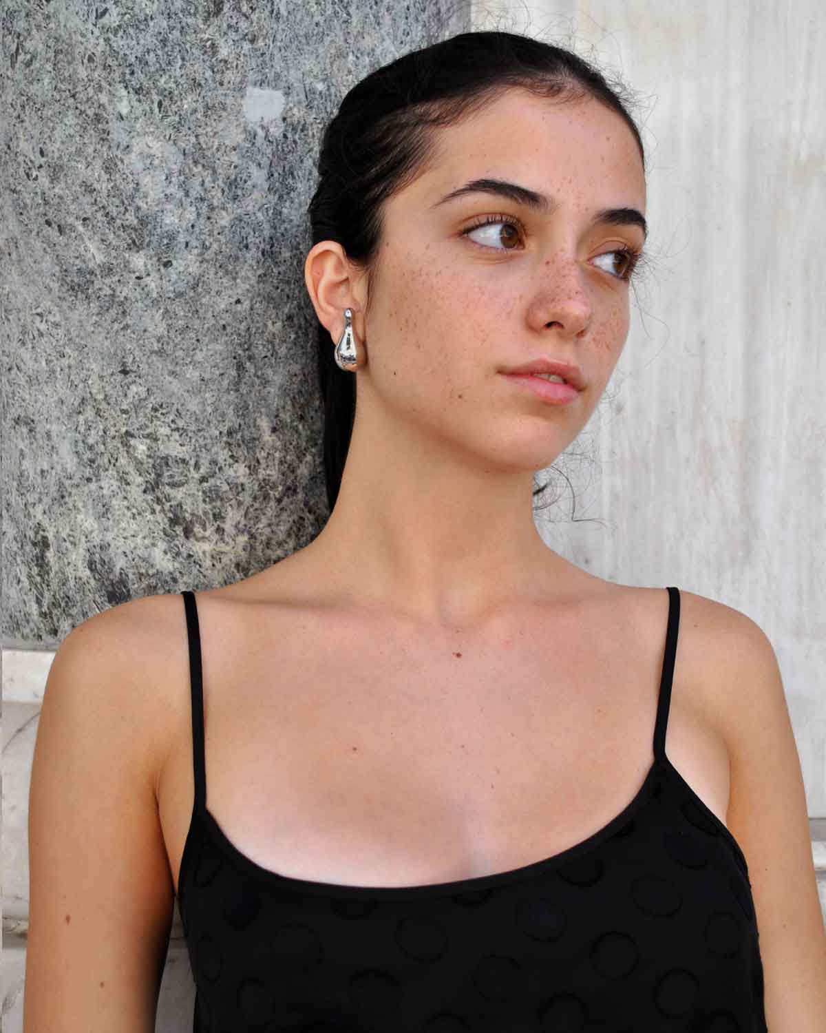 Continuous curves of polished silver flow together in sculptural motion. The double form creates depth and rhythm, reflecting light with every turn of the head. Bold yet minimal, they echo the collection’s essence of fluid metal. Pair with the Silver Liquid for a seamless line of movement.
