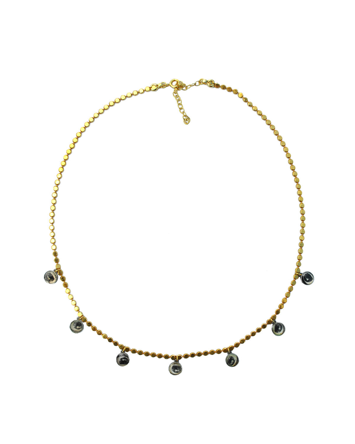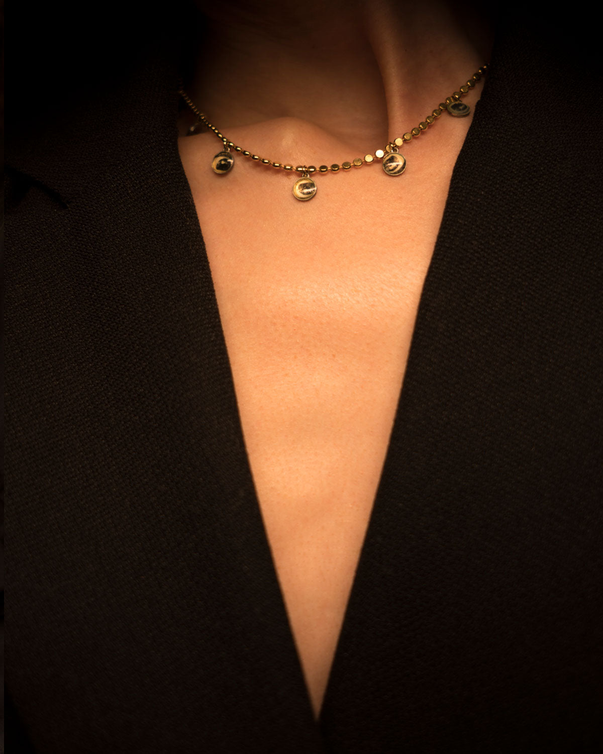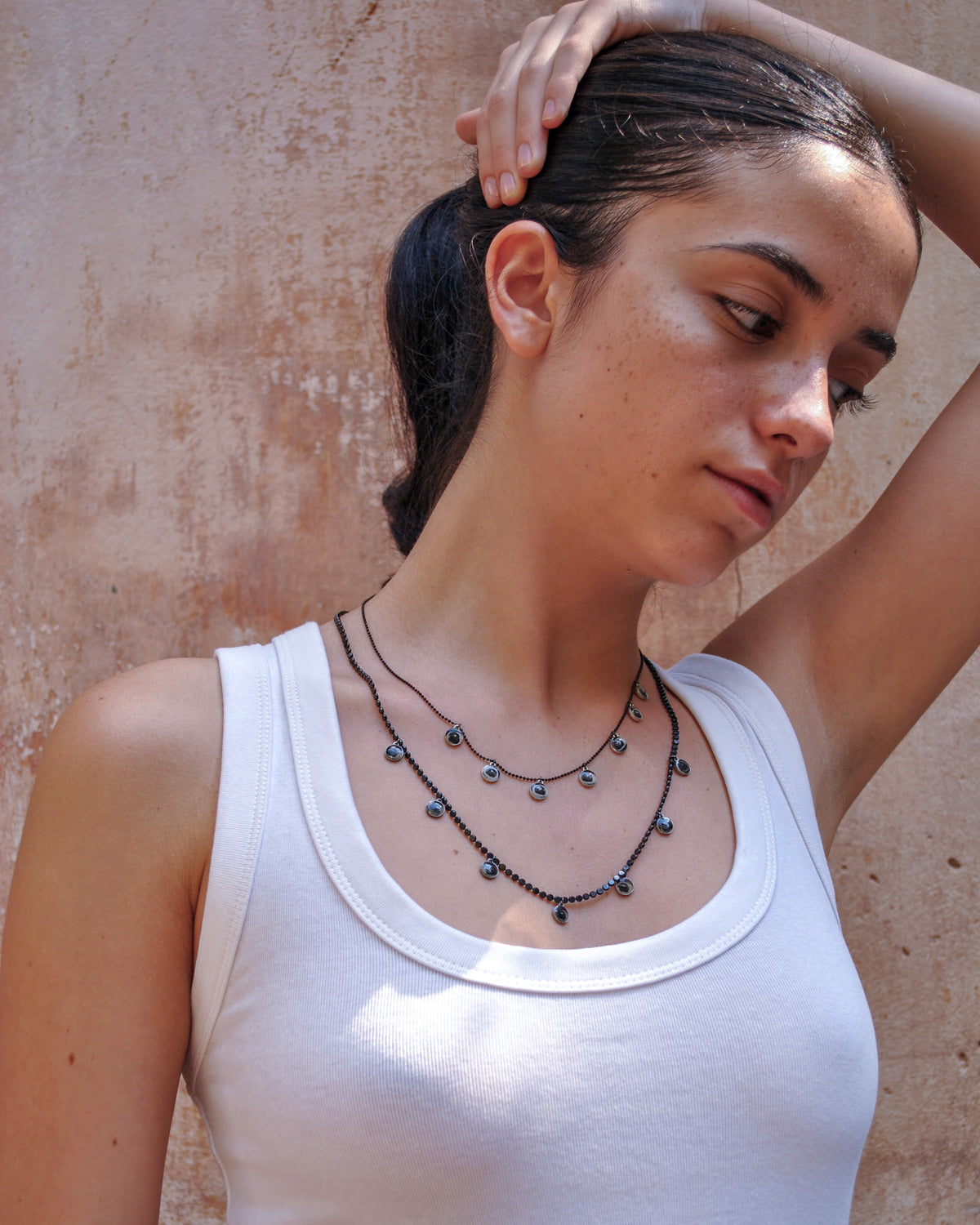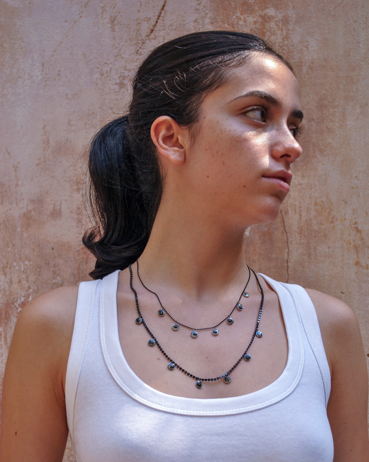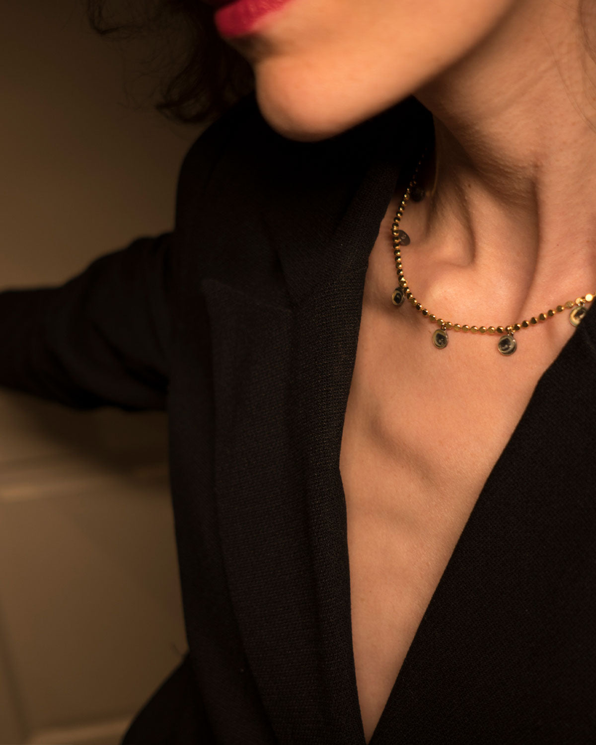 Seven very discrete eyes link together on a thick dotted chain, creating a necklace that’s as unapologetic as it is iconic. Wear it solo for maximum impact, or layer it with other eyes to build a statement that feels personal and powerful. This head-turner adds instant attitude to any look, from streetwear to night-out chic, radiating pure confidence and individuality. Wear it as a standalone piece or layer it with multiple eye pendants from the same collection.