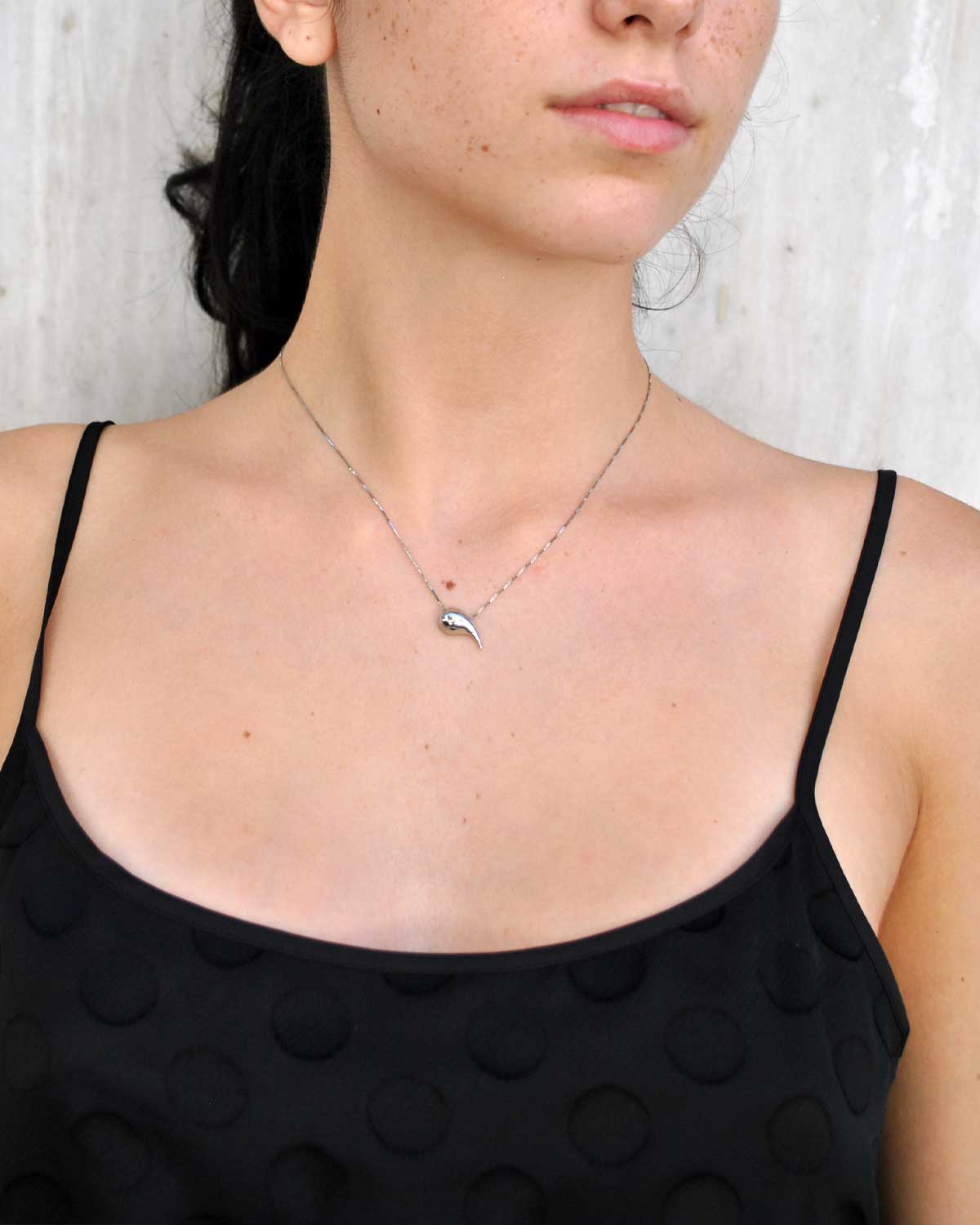 A single silver drop, suspended on a delicate chain. Minimal yet sculptural, it’s perfect for everyday looks. Style with the Silver Drop Pendant Large for a layered silver flow.
